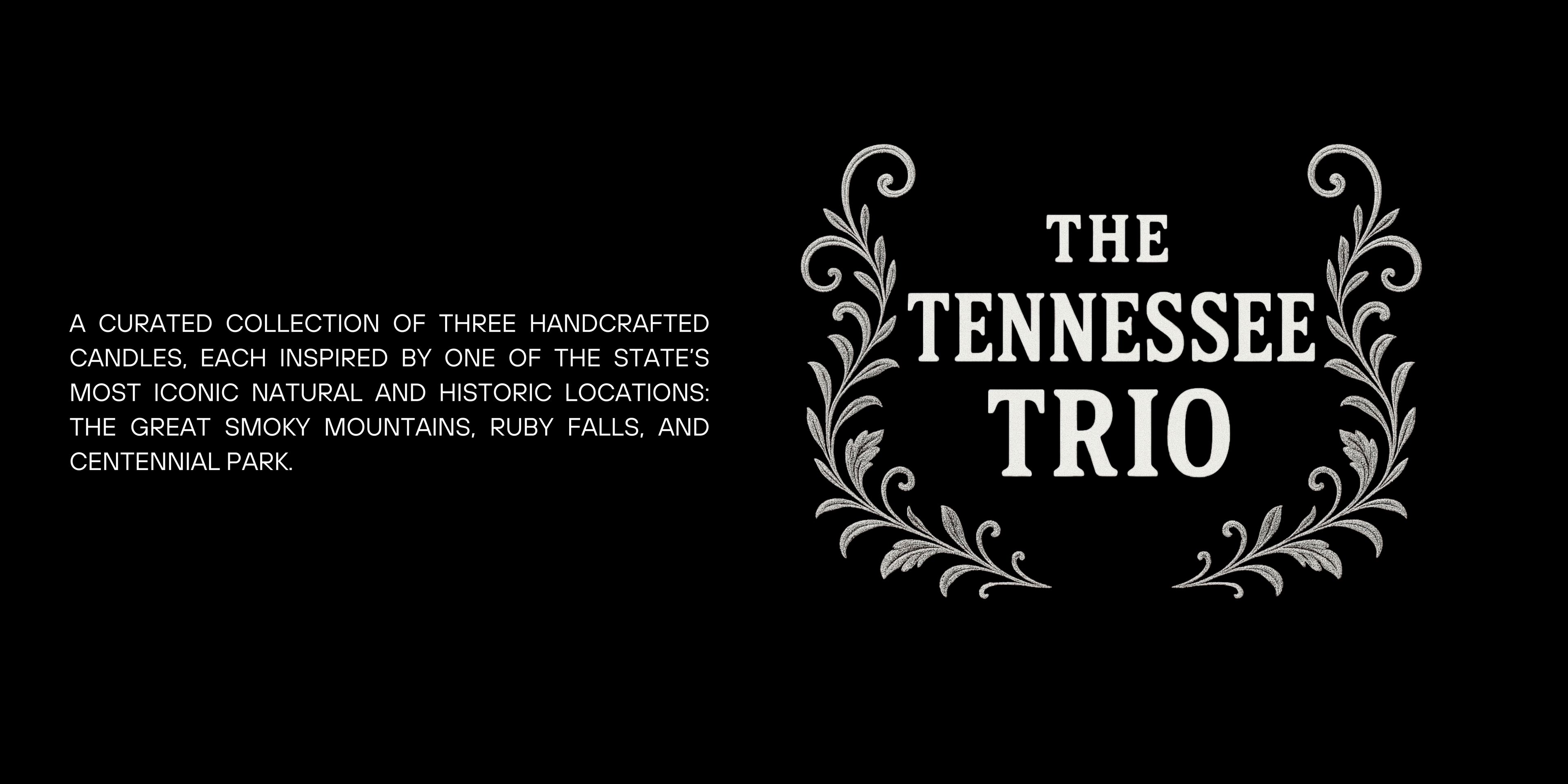 A curated collection of three handcrafted candles, each inspired by one of the state’s most iconic natural and historic locations: The Great Smoky Mountains, Ruby Falls, and Centennial Park. Each candle is crafted with 100% pure soy wax and the finest fragrances. We prioritize sustainability, ensuring each candle is eco-friendly, vegan, non-toxic, paraben-free, and includes all-natural ingredients.